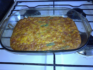 Spray a casserole dish with oil. Mix all ingredients in a bowl. The mixture needs to hold together but not be too runny or too stiff. I put in 1/2 cup flour which made it a bit stiff so I added a little milk, no more than a tablespoon or two. Cook at 200C for about 1/2 an hour. If you stick a knife in and it comes out clean it’s cooked.