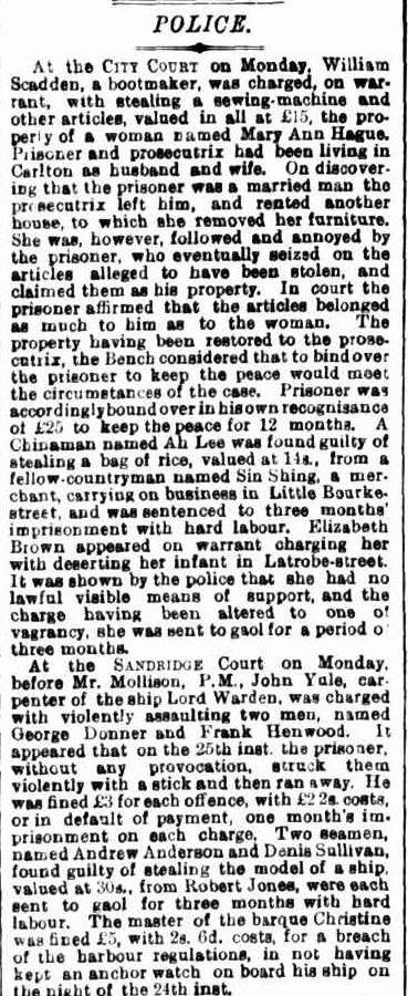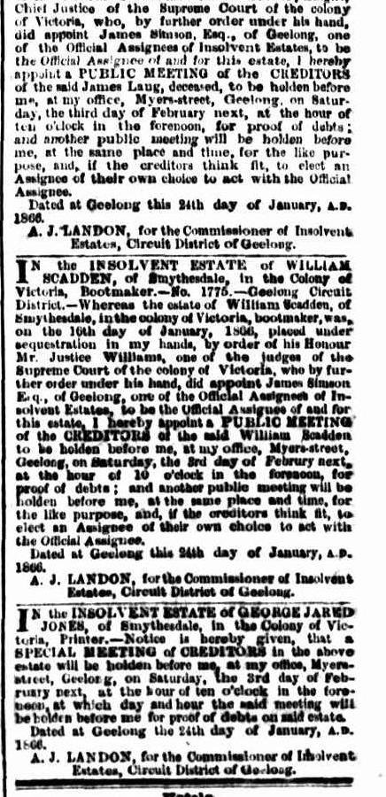 There was a William Scadden, a bootmaker living in Victoria in January 1866. Our William Henry Scadden (GG) didn’t come to South Australia until March 1866.