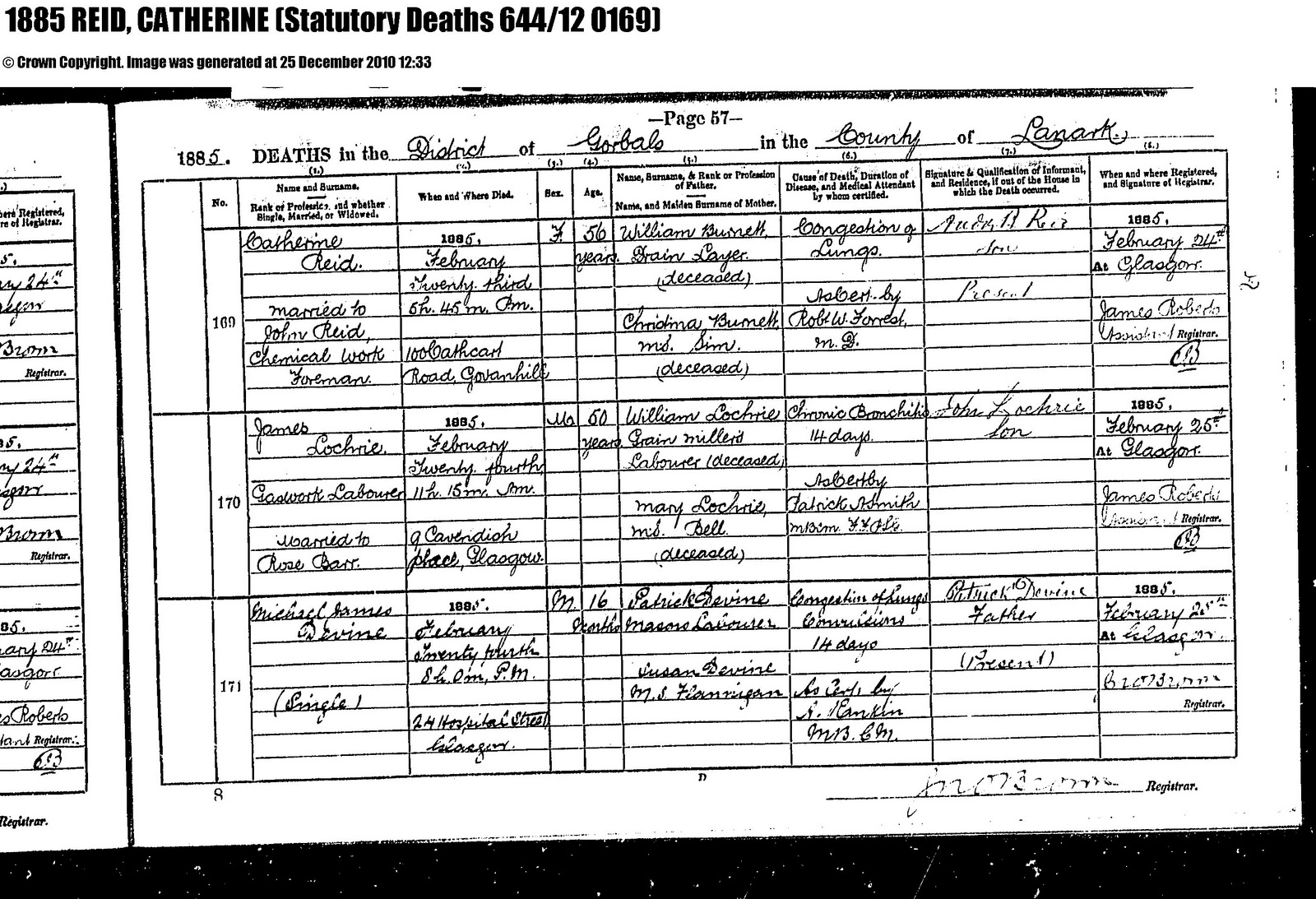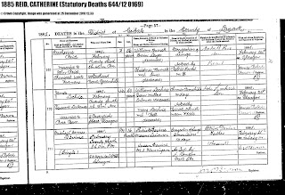 While I was working on this family I found both John and Catherine’s death registrations on Scotland’s People. Catherine’s parents are listed as William Burnet and Christina Sim. John’s parents are listed as James Reid and Christina Syme. I’m wondering if this was a mistake or if these are two different people or the same person. Does anyone have any suggestions on what I can do to clear this up. I haven’t been able to find birth records for either John or Catherine.