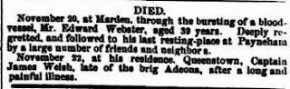 Ellen had only been married ten years when her husband, Captain James Welsh, became sick. The newspaper said it was a long and painful illness, to which he succumbed on 22 Nov 1860.
