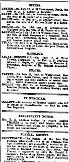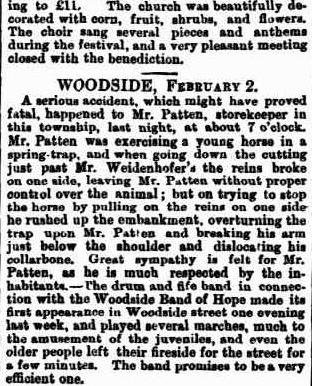 Newspaper records show that John continued as a storekeeper in Woodside. Alice Patten is born in 1869, and died shortly thereafter in March 1870.
